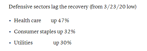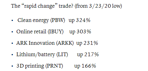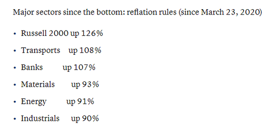 尽管标准普尔指数的11个板块远好于2020年3月的低点,变动最大的是那些直接受益于美联储和国会慷慨援助的行业:小型股、大宗商品、周期性行业如运输和工业,这就是所谓的“再通货膨胀交易”。