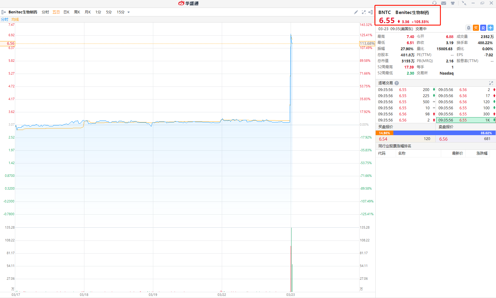 华盛资讯3月23日讯,美股盘初,生物科技公司Benitec生物制药(BNTC.N)持续暴涨,截至发稿该股上涨105%,股价报6.55美元。消息面上,摩根士丹利对该公司的持股增加了约5.2%。