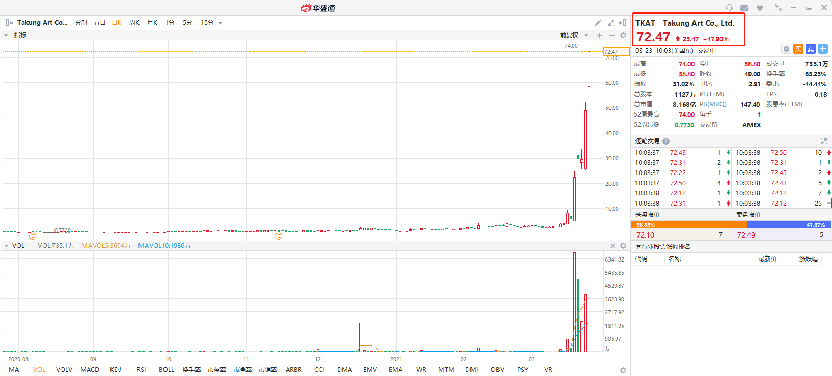 华盛资讯3月23日讯,美股盘初,NFT概念股上扬。截至发稿,香港大公文化集团Takung Art(TKAT)涨超47%,股价报72.47美元。