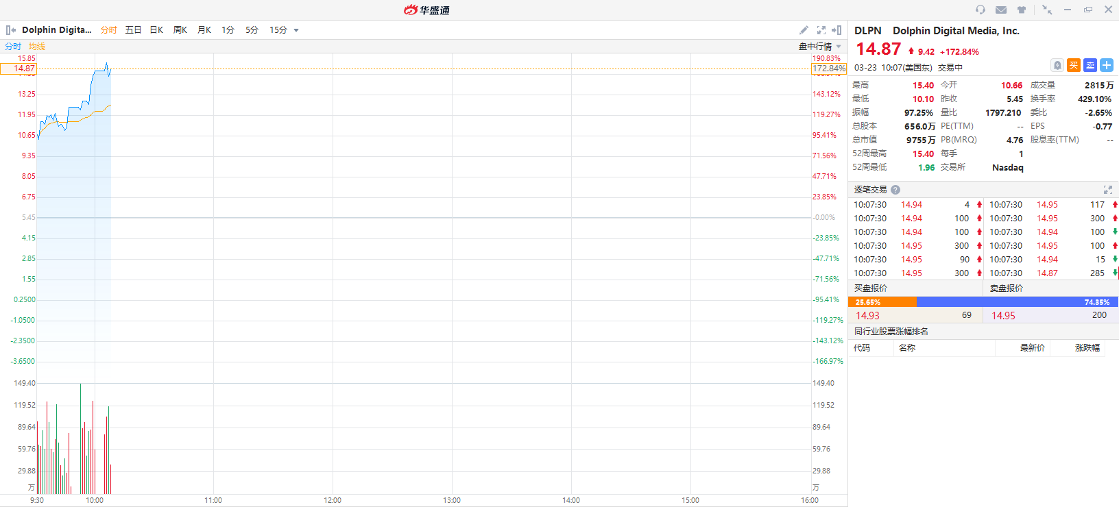 其它热门个股,美股海豚娱乐公司Dolphin Entertainment(DLPN.O)盘中多次触发熔断,截至发稿,该股已恢复交易,现涨超170%,股价报14.87美元。