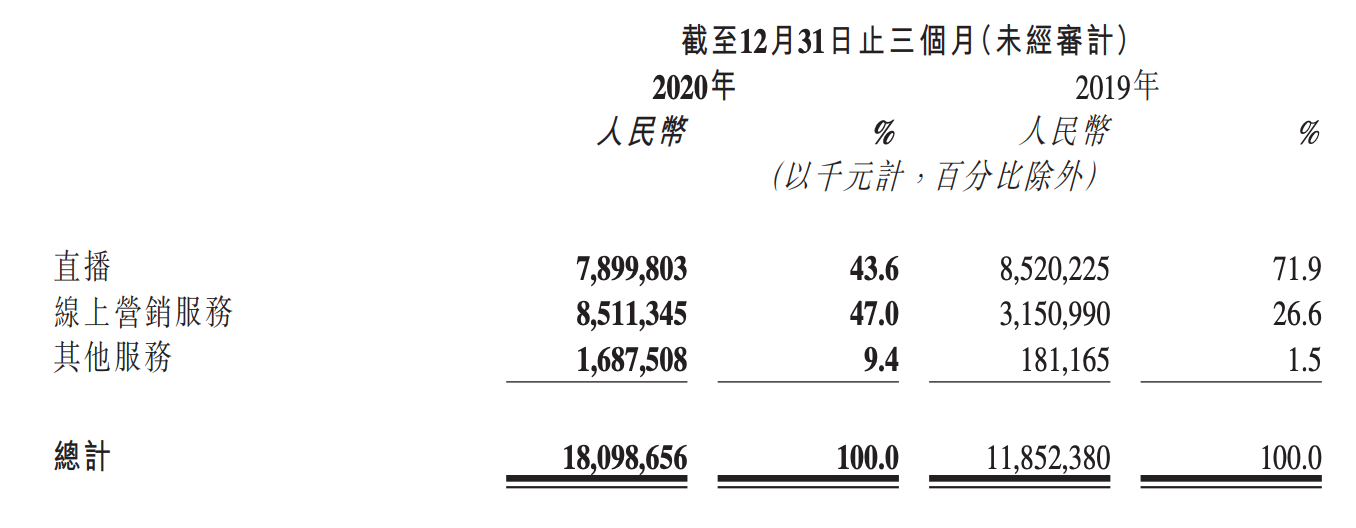 值得注意的是,2020年四季度,线上营销服务成为快手最主要收入来源,其收入占总收入的比例首次超过直播。
