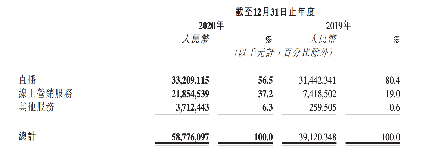 分业务来看,2020年快手的直播收入从2019年的314亿元增长5.6%至人民币332亿元,但其在总营收的占比则从2019年的80.4%下降至56.5%。