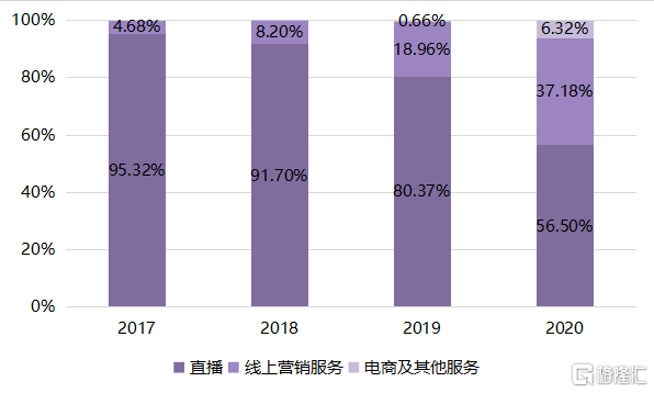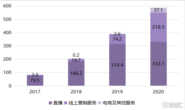 1.直播业务:2020年营收332亿元,同比增长5.6%,主要是由于用户群体扩大导致付费用户人数增加,直播平均每月付费用户由2019年的48.9百万人增至2020年的57.6百万人;