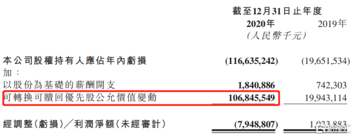 而从经营亏损下一步到归母净利润,显示亏损从103亿变成了1166亿,其中影响最大的一项叫做“可转换可赎回优先股公允价值变动”,这一项亏损有1068.5亿。