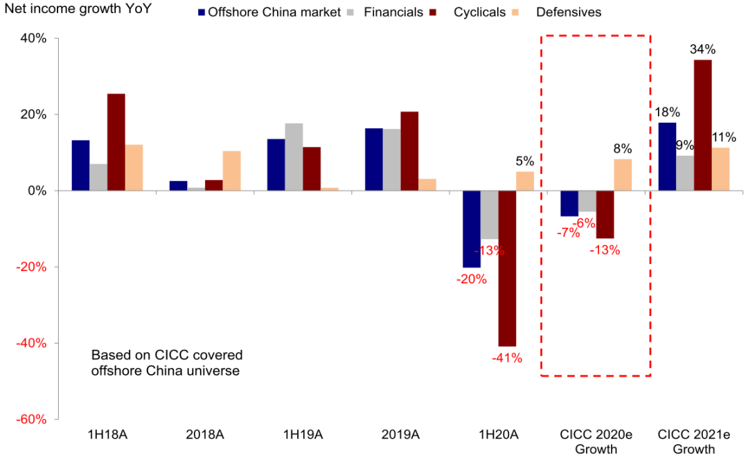 ► 首先,从大类板块来看,针对中金覆盖的海外中资股样本,基于人民币口径和中金行业分析师的预测,中金行业分析师预计2020年全年周期性行业净利润同比下降13%,降幅最大;金融板块净利润下滑6%;而防御性板块业绩有望实现8%的增长。具体而言: