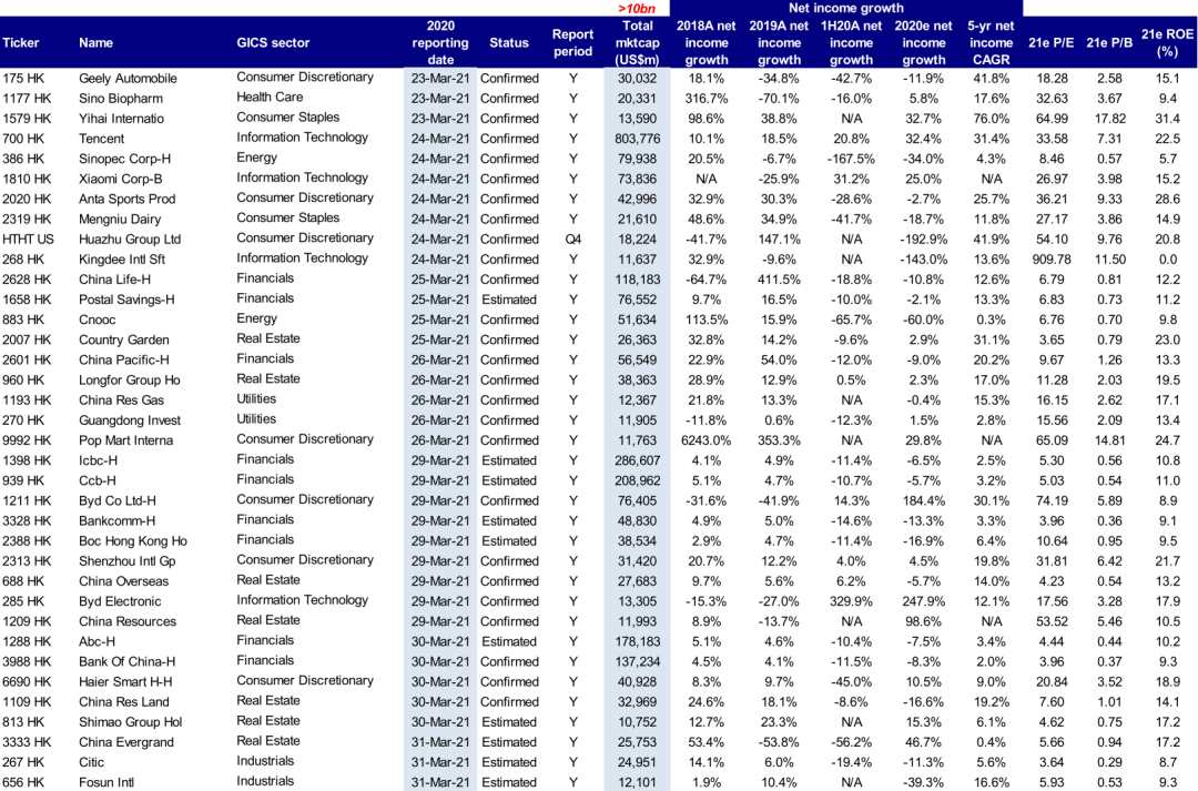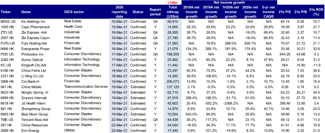 个股方面,美国上市的中概股(例如哔哩哔哩、网易、理想汽车及唯品会等)都已在三月中上旬公布2020年业绩,而部分市值规模较大的H股上市公司(例如农夫山泉、京东健康、思摩尔国际和泡泡玛特等)都将在3月中下旬公布其2020年业绩,值得密切关注。