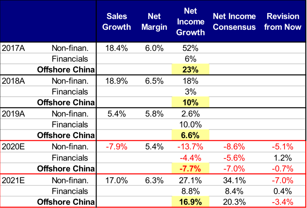 为了对2020年全年盈利增长情况有一个更好的了解,我们针对中金覆盖的约370支海外中资股(包括香港和美国上市的中资公司)对中金行业分析师的观点和预测进行内部问卷调查,并从自下而上角度汇总分析。虽然取样范围仅限于中金公司覆盖的样本,但是考虑到所覆盖公司均为各行业的龙头,因此基本可以反映2020年全年整体业绩情况。