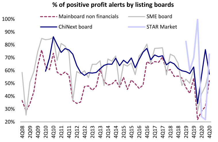 图表: 主板、中小板、创业板和科创板公司发布正面业绩预告的比例