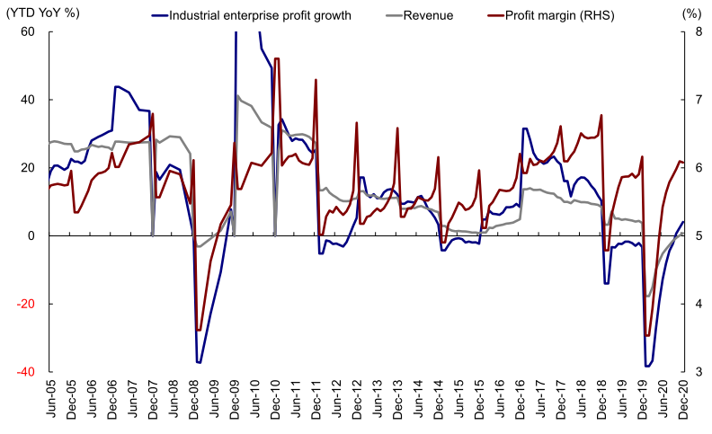 ► 收入端:中国经济复苏持续深化,有望带动中国名义GDP实现低基数下的高增长。中金宏观团队预计2021年名义GDP增速或将达到9%,而非金融企业的收入增速与名义GDP增速高度相关。从复苏路径和结构上,相比投资和外需,消费在经济复苏中较为落后,2020年12月社会消费品零售同比增长4.6%,远低于2019年12月8.0%,说明消费复苏还有较大空间,因此经济持续复苏的背景下,我们认为企业收入仍有望持续修复,特别是对于在疫情下受损较大的行业。