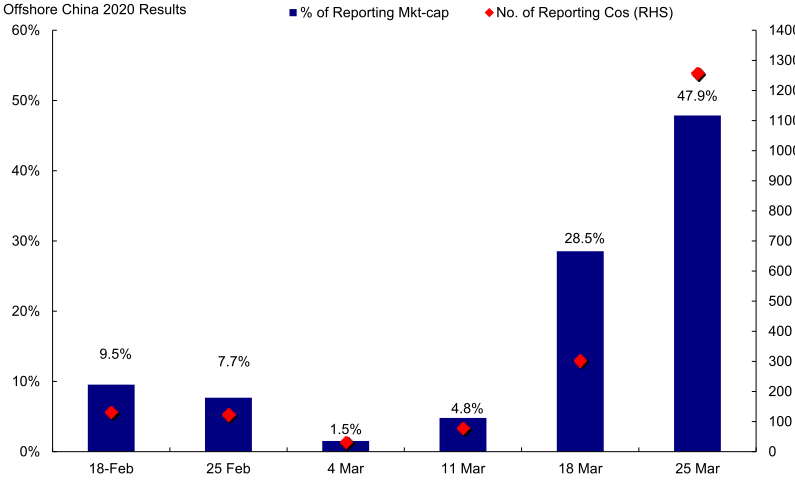 根据彭博资讯提供的预测信息,海外中资股(香港和美国上市的中资公司)2020年年报业绩期于2月下旬拉开帷幕,预计高峰期将在3月中下旬,大约75%的上市公司将于3月份最后两周发布中期业绩。
