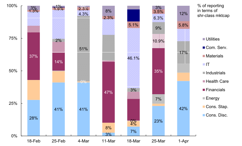图表: 日常消费主要在前期发布业绩,而可选消费、金融和能源板块则集中在后期