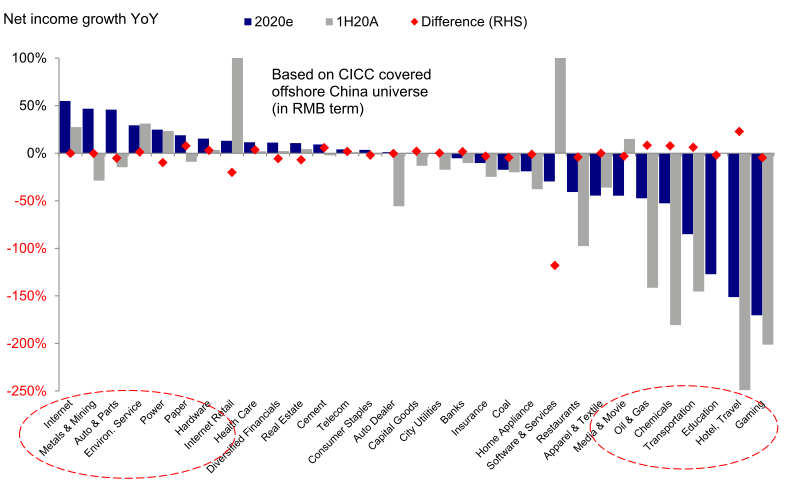 图表: 线上活动相关、金属和矿业以及汽车板块2020年中期业绩增速居前,但博彩、旅游等线下消费以及交通运输、教育和化工板块2020年业绩降幅最高