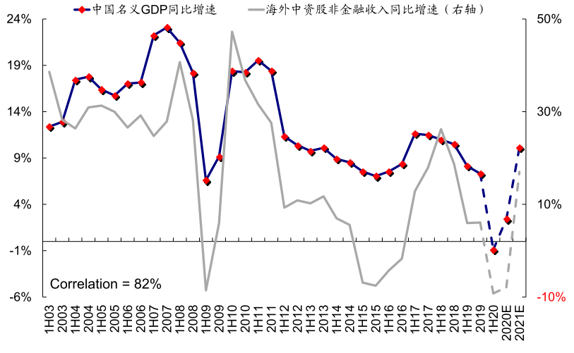 2020年受新冠疫情冲击,海外中资股业绩普遍遭受重创,尤其是上半年盈利同比增速从2019年的16%左右大幅降至-20%,回落趋势甚至超过了2008年全球金融危机时期。