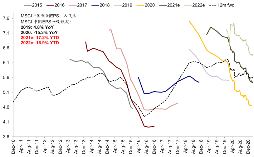 从当前市场预期看,近期市场对于MSCI中国指数的一致盈利预期有所企稳。具体而言,市场一致预期预计MSCI中国指数2021年盈利增速为16.6%。