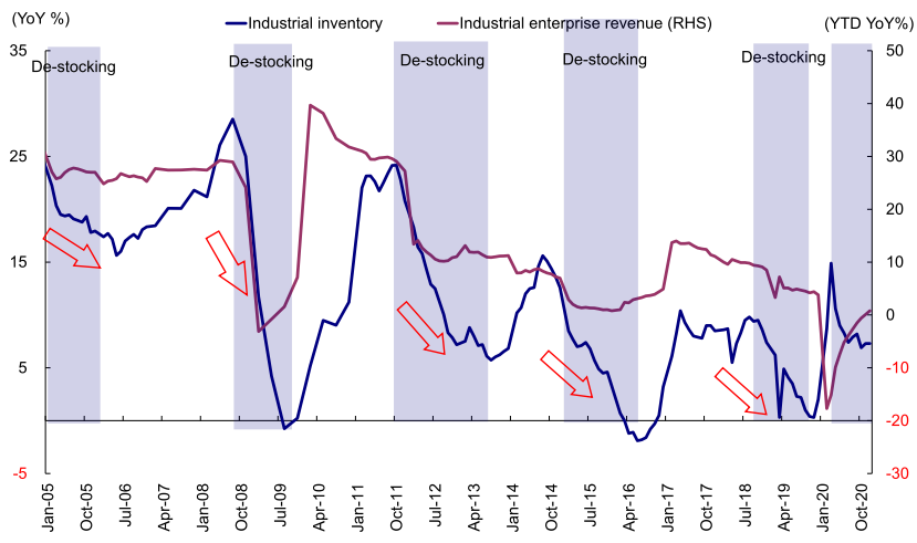 图表: 随着全球经济共振复苏,需求回升激发潜在再库存周期开启,或将提振企业收入