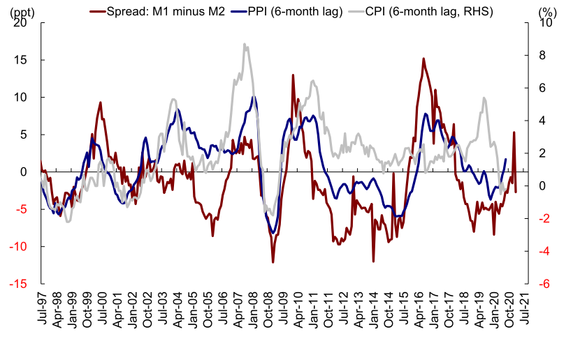 尽管受上半年拖累,全年业绩仍将个位数下滑,但下半年降幅明显收窄表明盈利修复逐步兑现,近期市场一致预期以及A股的业绩预告正面比例不断提升也印证了这一点。展望未来,随着经济活动的持续修复、库存甚至投资周期的启动,都有望给企业盈利继续提供支撑,我们预计受疫情影响大的板块修复弹性更大。从成本端看,近期PPI走高或挤压部分中下游企业利润率,但从M1-M2领先效果看我们预计可能逐步回落。