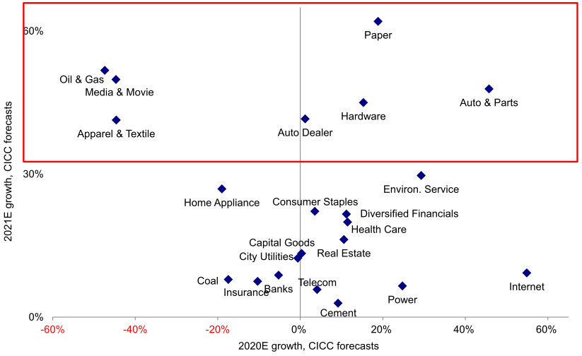 展望2021年,随着经济深化复苏与消费需求提升,上述遭受冲击较为严重的板块如交运、酒店等服务业和消费业有望在疫情渐行渐远的背景下实现超过400%和150%的盈利增长,互联网零售以及服装等零售行业有望出现强势复苏。同时,上游周期板块(包括能源、化工和原材料)随着经济基本面和全球需求改善有望呈现明显的回升趋势。