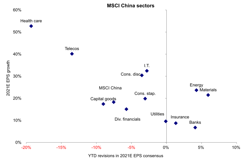 图表: 年初至今MSCI中国各板块2021年每股盈利预测调整 vs. 盈利预期