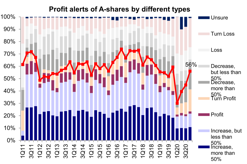 图表: 在已经发布2020年业绩预告的A股公司中,56%的公司发布了正面业绩预告,高于2020年3季度的45%