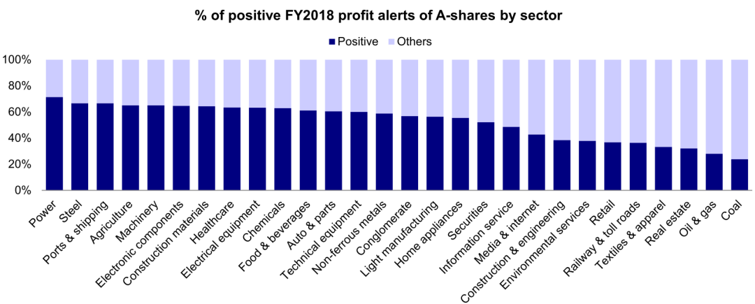 图表: 电力、钢铁等行业业绩向好比例较高,房地产、油气及煤炭业绩向好比例较低
