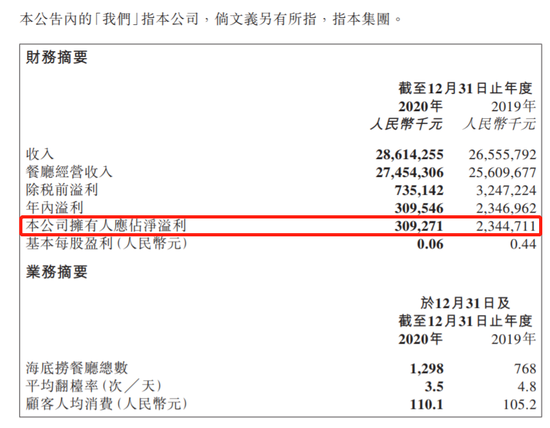 海底捞发布2020年全年业绩公告。2020年全年,海底捞集团实现收入286亿元,同比增长7.8%;全年净利润3.09亿元,抹平2020年上半年因疫情导致的9.65亿元亏损,实现盈利,但净利同比下滑86.81%,低于预期净利下滑幅度。