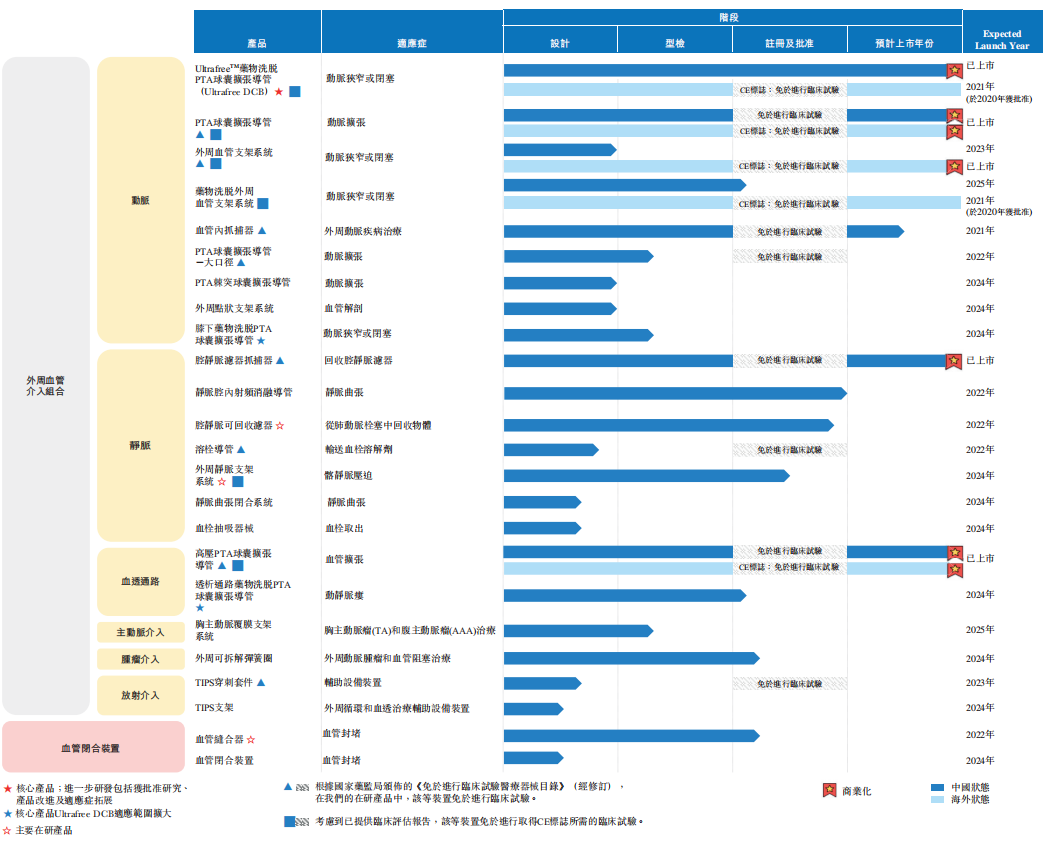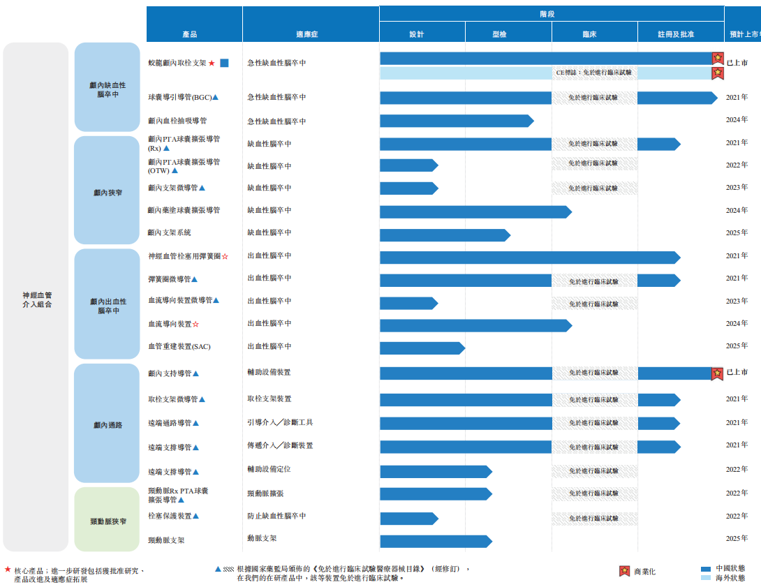 截至最后实际可行日期,产品组合包括中国及海外的合共8款获批产品,其中包括2款用于治疗神经血管疾病的获批产品及6款用于治疗外周血管疾病的获批产品。公司亦在中国拥有39款处于不同开发阶段的在研产品,其中8款处于注册阶段、9款处于临床试验阶段、8款处于型检阶段及14款处于设计阶段。