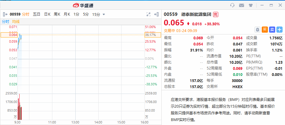 华盛资讯3月24日消息,德泰新能源集团早盘爆发式上涨。截止发稿,德泰新能源集团涨超38%,现报0.065港元每股,总市值10.2亿港元,成交量超1.7亿港元。