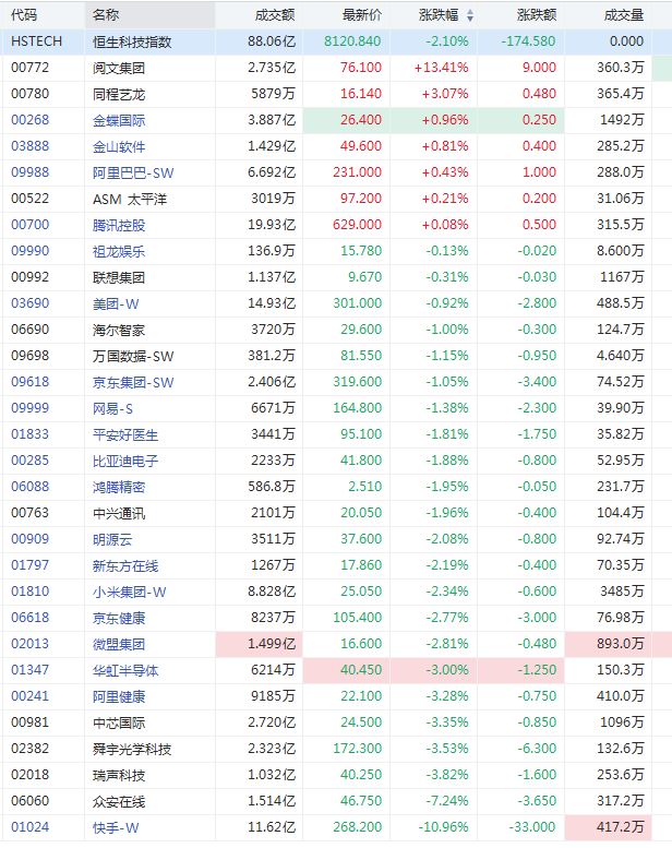 华盛资讯3月24日消息,恒生科技指数低开低走,现跌2%,报8120点,南方恒生科技跟跌2.13%。截至发稿,阅文集团大涨13%,同程艺龙涨超3%,阿里微涨。众安在线跌超7%,快手跌10%。