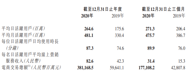 3、2020年,快手应用的平均日活跃用户及平均月活跃用户分别为2.646亿及4.811亿,分别同比增长50.7%及45.6%;