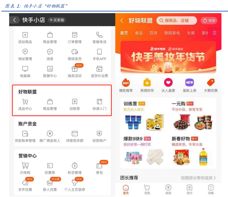 电商生态方面,快手对供应链和流量普惠两手抓。公司一方面引入品牌供应链,一方面通过“好物联盟”为达人对接优质货源,从供给端打通品牌上行通道。