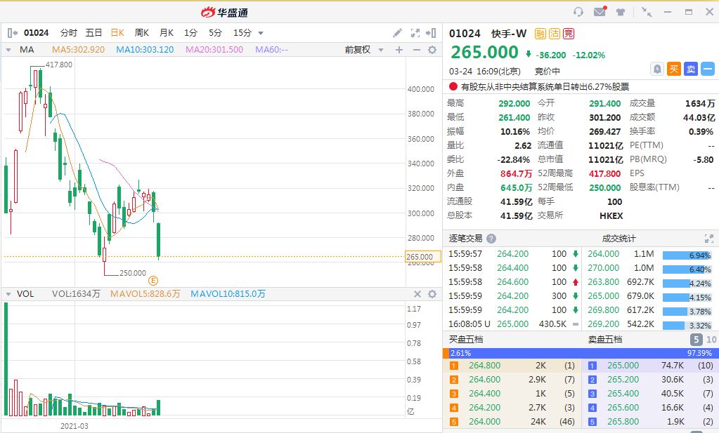 在3月24日港股盘中,快手股价呈现低开低走的趋势,收盘股价跌超12%。按照当下股价265港元水平,相比较快手上市后2月中旬创出的股价高点417.8港元计算,累计回调幅度已接近40%。