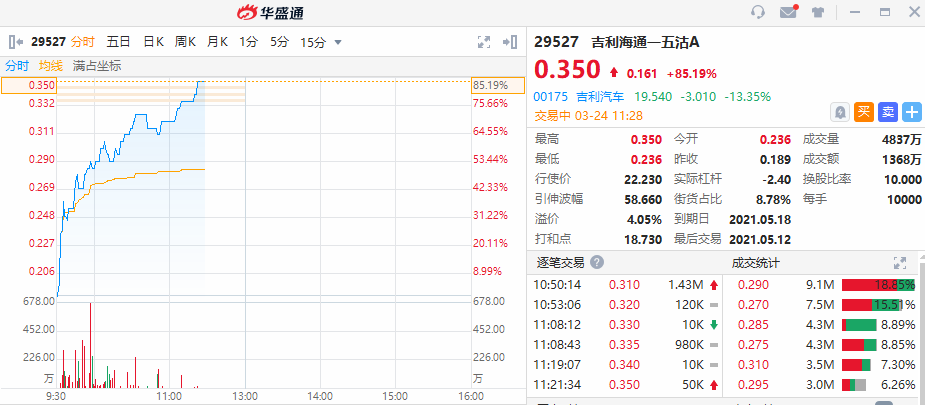 相关窝轮方面,吉利海通一五沽A大涨超85%,其行使价为22.23港元,2021年5月18日到期,接货比为8.78%。