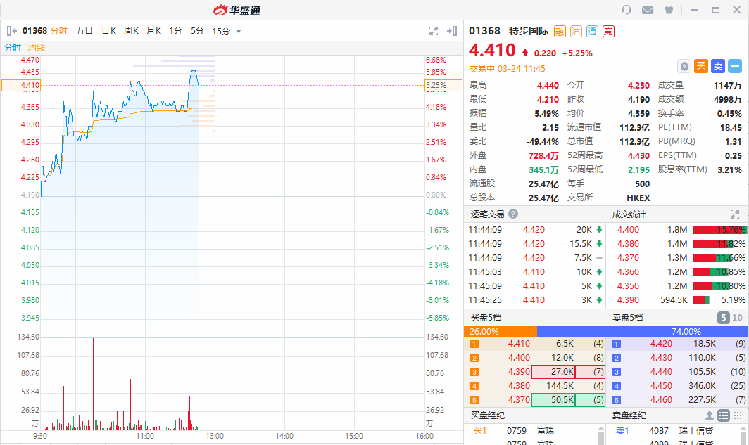 华盛资讯3月24日消息,特步国际盘中短线拉升逾5%,创自19年11月以来新高。截至发稿,特步涨5.25%,现报4.41港元每股,暂成交4998万港元,当前总市值为112.3亿港元。