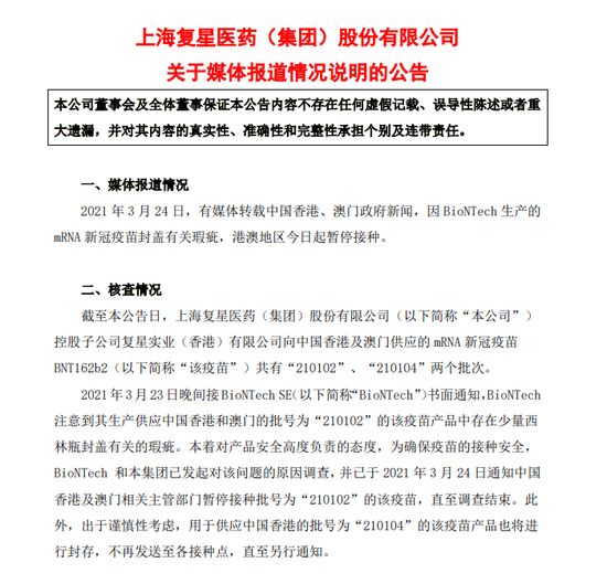 3月24日消息,复星医药A股跌6.4%H股跌6%,疫苗暂停在香港、澳门使用并作封存。