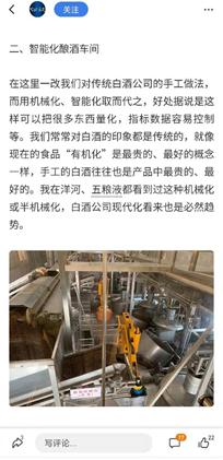 同时,通过实地走访,也令不少球友进一步打开了视野。@七彩云龙 在参观了今世缘的智能化酿酒车间后坦言,结合在洋河、五粮液(行情000858)等酒业看到的类似操作,对于白酒公司现代化有了新的认识。
