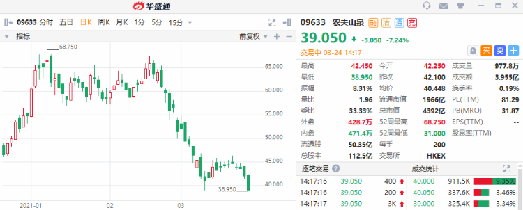 农夫山泉午后大跌超7%,自高点暴跌逾40%,截至发稿,报39.05港元,市值4392亿港元。