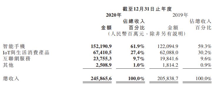 2020年,小米集团IoT与生活消费产品部分的收入达到人民币674亿元,同比增长8.6%;2020年第四季度,IoT与生活消费产品部分的收入达到人民币211亿元,同比增长8.0%。