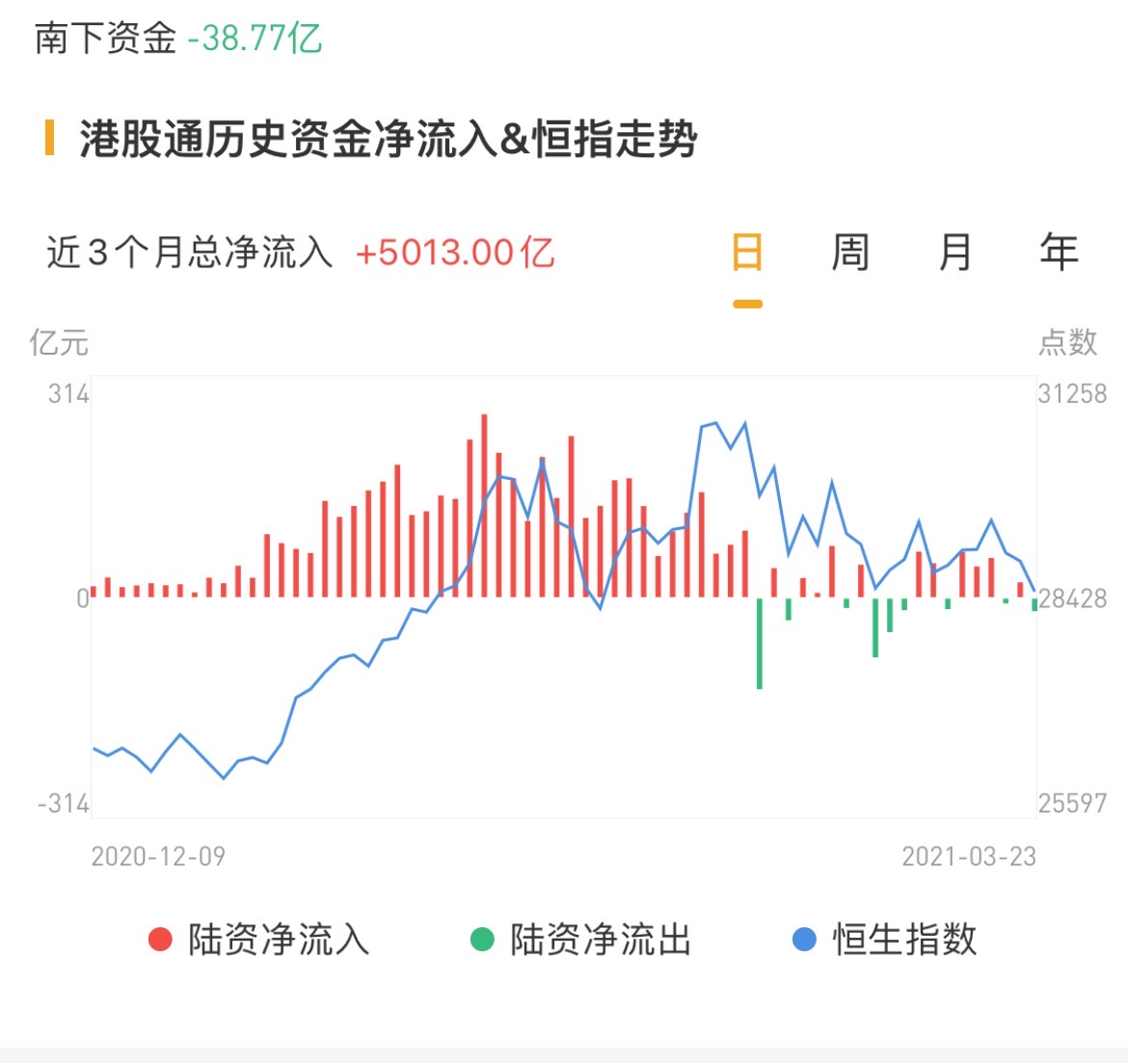 南下资金今日净流出38.77亿港元,周二净流出超17亿港元.