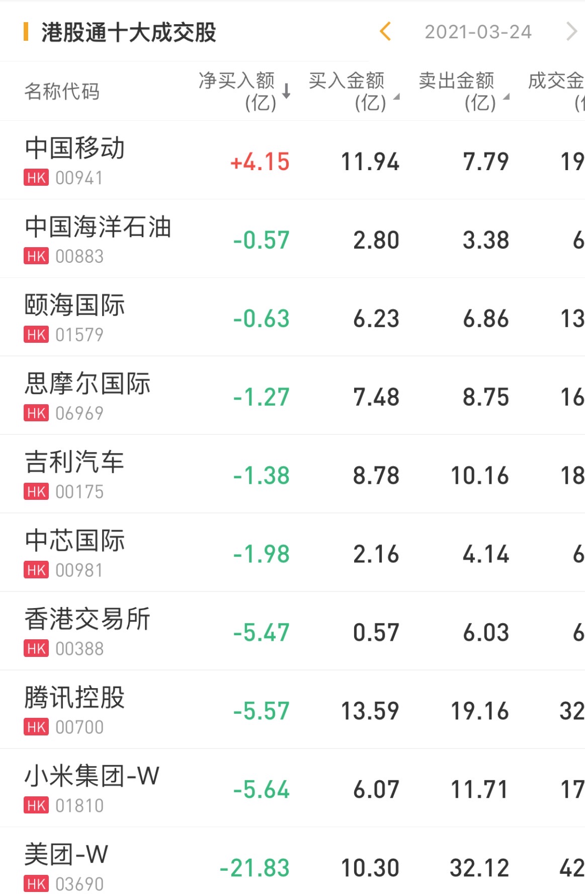 个股方面,今日南下资金净买入中国移动,净买入额达4.15亿港元,为今日买入之最。