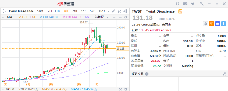在此阶段,Twist正在经历高增长投资者熟悉的模式。在最近的季度数据中,Twist公布的收入增长了64%,亏损较上年同期有所收窄。然而,该股未能上涨,让人有所议论,认为Twist近期的上涨使其无法从商业基本面方面的好消息中受益。周二下午,该公司股价又下跌了2%,但对那些对基因组学股票感兴趣的人来说,这只会让公司的价值定位变得更好。