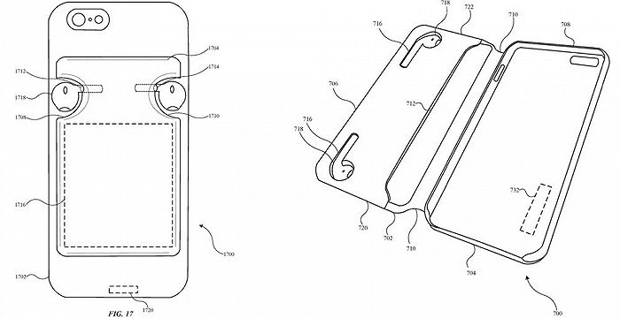 还有一些比较有意思的苹果专利显示,他们还在为AirPods产品开发新的手机保护壳,用户可以把耳机存放在iPhone手机壳中并进行充电。