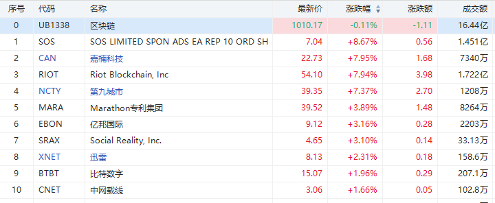 华盛资讯3月24日消息,美股区块链板块走高,嘉楠科技(CAN.O)涨超7%,Riot Blockchain(RIOT.O)涨近8%,第九城市(NCTY.O)涨超7%。