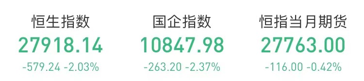 恒生指数开盘跌0.21%,早盘单边下挫,跌穿二万八关口,午后维持窄幅震荡。截至收盘,恒生指数跌579.24点或2.03%,报27918.14点,全日成交额达1901.71亿。国企指数跌2.37%,报10847.98点,恒生科技指数跌3%。