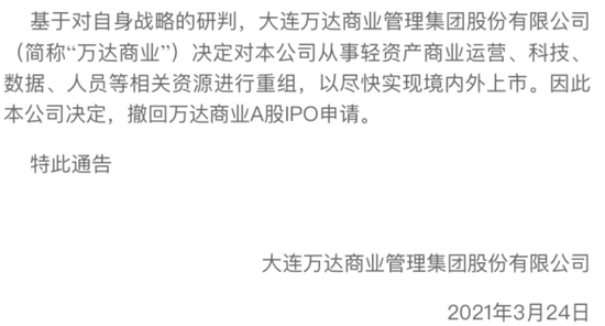 2021年3月24日,大连万达商业管理集团股份有限公司(简称“万达商业”)发布通告称,基于对自身战略的研判,决定对本公司从事轻资产商业运营、科技、数据、人员等相关资源进行重组,以尽快实现境内外上市,因此决定撤回万达商业A股IPO申请。