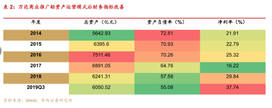2015年以后,万达商业全面转型轻资产运营模式以后财务指标明显改善。资产负债率从2014年最高72.51%大幅下降到2019Q3的55.08%,反过来资产变轻以后,现金流稳定,净利率也显著上升。