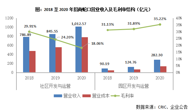 2020年,受益于房地产销售业务结转规模以及物业管理业务规模扩大,招商蛇口实现营业收入同比增长32.7%至1296.2亿元,营收规模大幅上升。从收入结构来看,社区开发与运营、园区开发与运营、邮轮产业建设与运营三大业务板块占营业收入比重分别为78.1%,21.8%以及0.1%,其中,邮轮产业建设与运营板块受疫情影响全部停航,收入同比下降79.2%,游轮业务恢复尚需时间,收入结构仍需平衡。