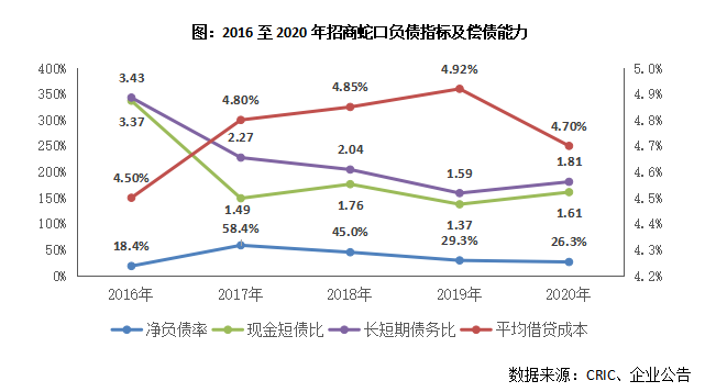 此外,在融资方面招商蛇口多渠道控制融资成本,积极开展融资工作,先后发行金额合计206.5亿元,包括超短期融资券、中期票据等产品,均为同期市场较优利率。2020年招商蛇口平均借贷成本仅为4.70%,同比下降22个基点,继续维持行业低位。