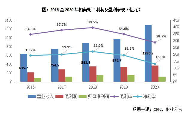 从结转利润和盈利水平来看,2020年招商蛇口实现归属于上市企业股东的净利润122.5亿元,较2019年的160.3亿元同比下降23.58%;实现毛利率28.7%,较2019年的34.6%降低5.9个百分点;净利率也从19.3%下滑至13.0%,利润增速下滑明显。