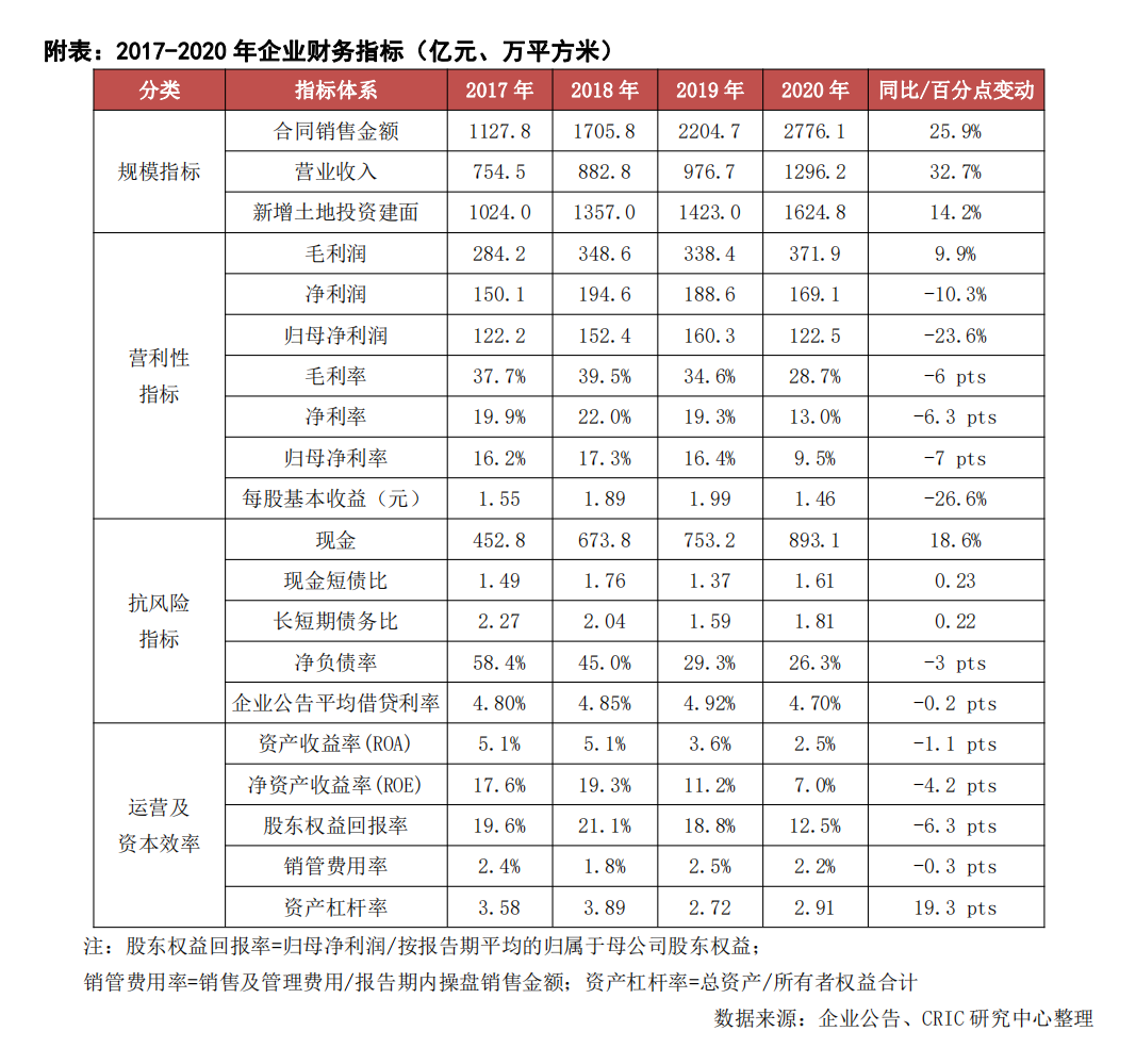 【归母净利润大幅下降,多元融资保持行业低位】2020年招商蛇口实现营业收入1296.2亿元,同比增长32.7%,营收规模大幅上升;归母净利润同比下降23.58%,增速下滑明显,主要受到行业利润率下滑、结转项目成本提升、计提减值准备、转让子公司投资收益减少以及疫情等因素的影响。净负债率26.3%,平均借贷成本为4.70%,继续维持行业低位。