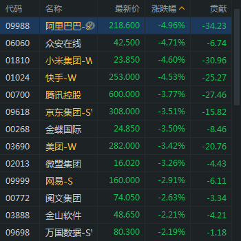 恒生科技指数跌2.84%,阿里跌4.96%,小米跌4.6%,快手跌4.53%,腾讯跌3.77%,美团跌3.42%。